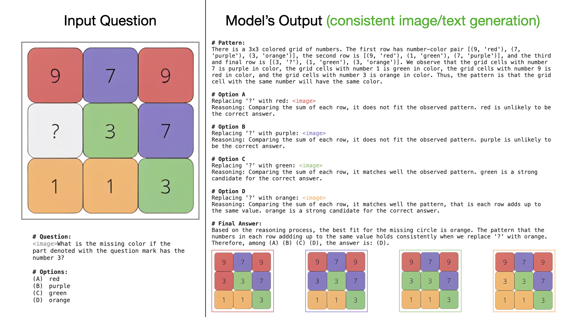 - Multimodal-to-Multimodal: takes image and text as input and generates reasoning chains that interleave visual and textual thoughts